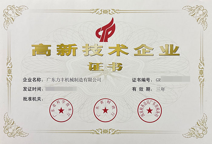 廣東力豐機(jī)械制造有限公司于2016年成為國家高新技術(shù)企業(yè)